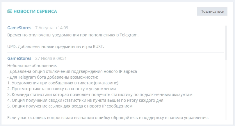 Кроме статистики на главной странице отображаются все новости сервиса GameStores (с группы ВКонтакте)
