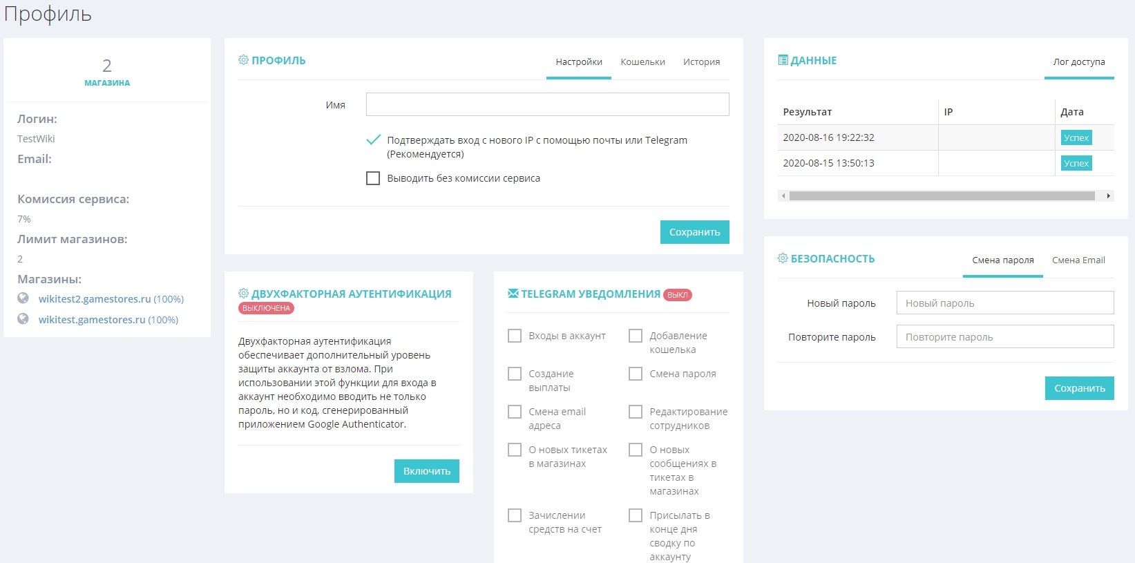 2. Комиссию сервиса, доступный вам лимит магазинов и ваши магазины;