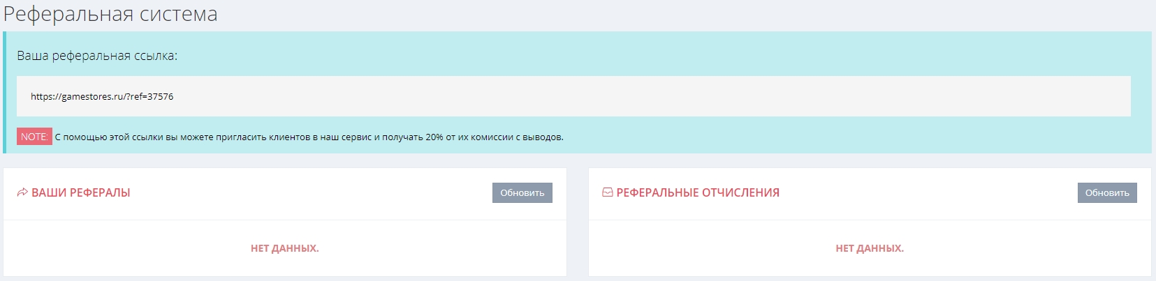 У каждого пользователя есть доступ к "Реферальной системе". С помощью ссылки, доступной в данном разделе, вы можете пригласить клиентов в сервис GameStores и получать 20% от их комиссии с выводов.