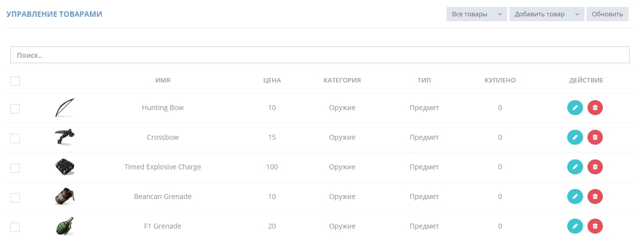 Вы можете добавлять товары любого вида (кроме запрещённых правилами сервиса). Товаром может послужить предмет, рецепт, команда, набор, рулетка, либо товар с выбором.