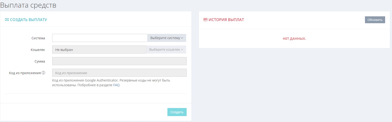 В сервисе GameStores существует возможность делать выплаты средств на электронные кошельки/банковские карты. Для создания выплаты вам потребуется выбрать систему (Qiwi, WebMoney, Яндекс.Деньги, Банковская карта), кошелёк, сумму выплаты и код из приложения GoogleAuth.