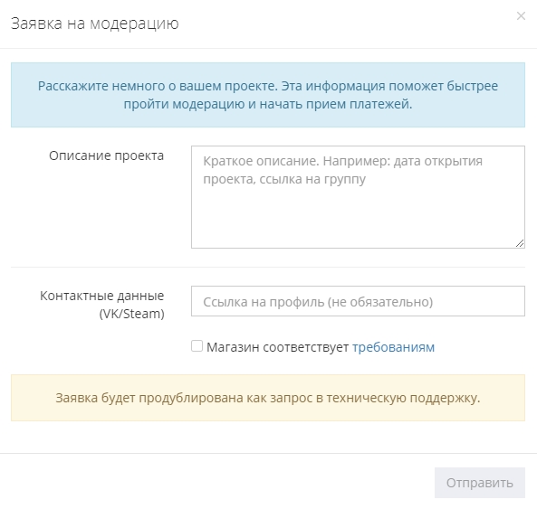 1. Требования к магазину 1.1 Магазин не должен продавать товары или услуги, запрещенные нормативно-правовыми актами, правилами международных платежных систем. 1.2 Все технические работы должны быть завершены. 1.3 Игровой сервер должен быть добавлен в мониторинг, плагин установлен и настроен на сервере. Протестировано получение товаров из корзины. 1.4 В магазине должны быть контактные данные администрации проекта (Email/VK/Виджет группы проекта в которой включен модуль сообщений) для оперативной обработки обращений игроков. Приветствуется использование модуля "Техподдержка", но не отменяет требование. 1.5 Добавлен собственный логотип или скрыт логотип GameStores. 1.6 Цены и список доступных товаров должны быть настроены в рамках политики вашего проекта. (Магазины со стандартным списком или малым количеством товаров не пройдут модерацию).
