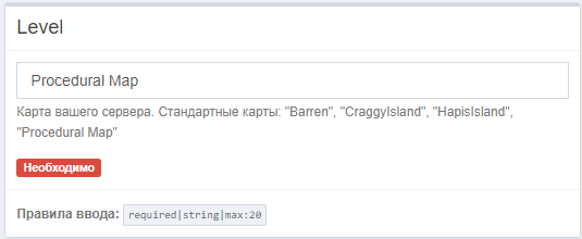 Level - тип карты. Стандартные типы карт - Procedural Map, Barren, CraggyIsland, HapisIsland. Для карт "Procedural Map" и "Barren" необходимы ещё два параметра - World Size (размер карты) и World Seed (зерно карты).