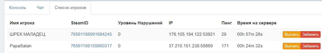Выполняем writecfg (чтобы после перезагрузки сервер игрок снова не стал админом или модератором). И кикаем игрока с сервера.